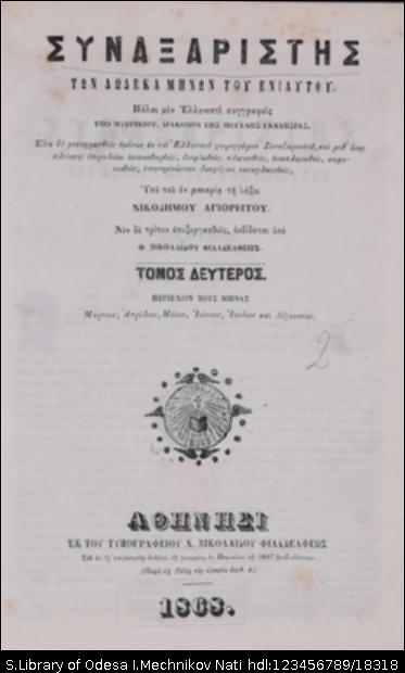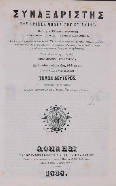 Бібліографічний опис: Μαυρίκιος, διάκονος. Συναξαριστής των δώδεκα μηνών του ενιαυτού : [σε 2 τ.] / πάλαι μεν Ελληνιστί συγγραφείς υπό Μαυρικίου διακόνου της Μεγάλης Εκκλησίας τω δε 1819 το δεύτερον μεταφρασθείς αμέσως εκ του ελληνικού χειρογράφου Συναξαριστού και μεθ' όσης πλείστης επιμελείας ανακαθαρθείς, διορθωθείς, πλατυνθείς, αναπληρωθείς, σαφηνισθείς, υποσημειώσεσι διαφόροις καταγλαϊσθείς, υπο του εν μακαρια τη ληξει Νικόδημος Αγιορείτης ; νυν δε τριτον επεξαρυασθεις εκδιδοται θπο Θ. Νικολα̈ιδου Φιλαδελφεως. – 3η έκδ. – Αθηνα : τυπ. Χ. Ν. Φιλαδελφεωσ, 1868. Т. 2 : Μάρτιος, Απρίλιος, Μάιος, Ιούνιος, Ιούλιος και Αύγουστος. – 1868. – 431, [1] σ.