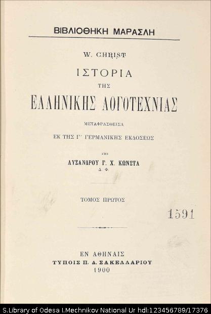 | Бібліографічний опис: | Christ, Wilhelm von (1831-1906). Ιστορια τησ ελληνικησ λογοτεχνιασ / μεταφρασθείσα εκ της Γ΄ γερμανικησ εκδοσωσ υπο Λυσανδρου Γ. Χ. Κωνστα Δ. Φ. - Αφηναισ : Τυπ. Π. Δ. Σακελλαριου, 1900. – (Βιβλιοθηκη Μαρασλη. Συλλογη εκκριτηων επιστημονικων χενων τε εν Ελληνικη, μεταφρασει και πρωτοτυπων συγγραμματων). Τ. 1. – 1900. – [4], 928 σ. |