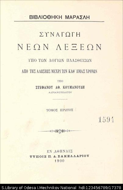 | Бібліографічний опис: | Κουμανουδη, Στεφανου Αθ. (1818-1899). Συναγωγη νεων λεχεων υπο των λογιων πλασθεισων απο τησ αλωσεωσ μεχρι των καθ ημασ χρονων / υπο Στεφανου Αθ. Κουμανουδη ... – Αφηναισ : Τυπ. Π. Δ. Σακελλαριου, 1900. – (Βιβλιοθηκη Μαρασλη. Συλλογη εκκριτηων επιστημονικων χενων τε εν Ελληνικη, μεταφρασει και πρωτοτυπων συγγραμματων; Π. 8). Τ. 1. – 1900. – 10, 1166, [2] σ. |