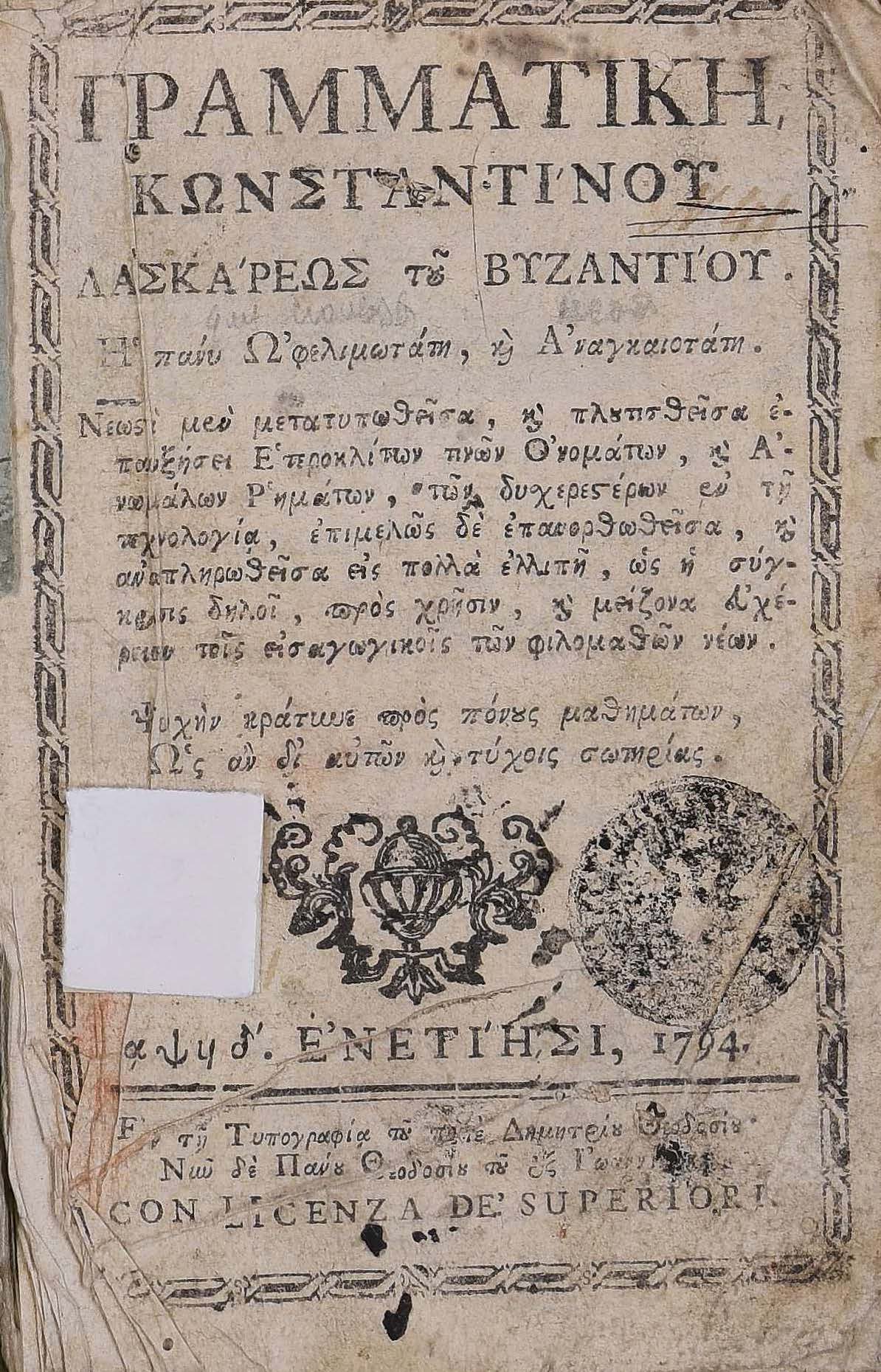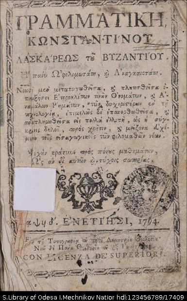 Бібліографічний опис: | Λάσκαρις, Κωνσταντίνος (1434–1501). Γραμματική Κωνσταντίνου Λασκάρεως του Βυζαντίου. Η πάνυ Ωφελιμωτάτη και Αναγκαιοτάτη : νεωστί μεν μετατυπωθείσα, και πλουτισθείσα επαυξήσει Ετεροκλίτων τινών Ονομάτων, και Ανωμάλων Ρημάτων, των δυσχερεστέρων εν τη Τεχνολογία, επιμελώς δε επανορθωθείσα, και αναπληρωθείσα εις πολλά ελλιπή, ως η σύγγρισις δηλοί, προς χρήσιν, και μείζονα ευχέρειαν τοις εισαγωγικοίς των φιλομαθών νέων. – Ενετίησιν [Venezia] : παρά Δημητρίω Θεοδοσίου τω εξ Ιωαννίνων, 1794. – 1-16, 27-76, 81-328, 369-461, 362 [i. e. 462] σ. ; 8⁰ (16х11х2,5 εκ.). |