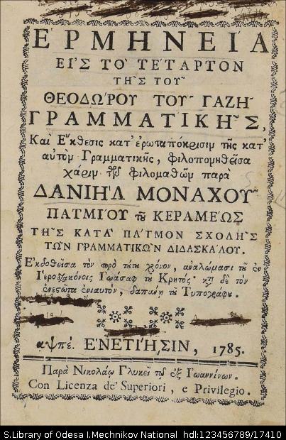 Бібліографічний опис: | Κεραμεύς, Δανιήλ. Ερμηνεία εις το τέταρτον της του Θεοδώρου του Γαζή Γραμματικής, και Έκθεσις κατ' ερωταπόκρισιν της κατ' αυτόν Γραμματικής, / φιλοπονηθείσα χάριν των φιλομαθών παρά Δανιήλ Μοναχού Πατμίου του Κεραμέως της κατά Πάτμον Σχολής των Γραμματικών διδασκάλου. Εκδοθείσα τον προ τούτου χρόνον, αναλώμασι του εν Ιεροδιακόνοις Ιωάσαφ του Κρητός' κατά δε τον ενεστώτα ενιαυτόν, δαπάνη του Τυπογράφου. – Ενετίησιν [Venezia] : παρά Νικολάω Γλυκεί τω εξ Ιωαννίνων, 1785. – ιβ΄[i. e. 12], 668 σ. ; 8° (17x11x3,5 εκ.). |