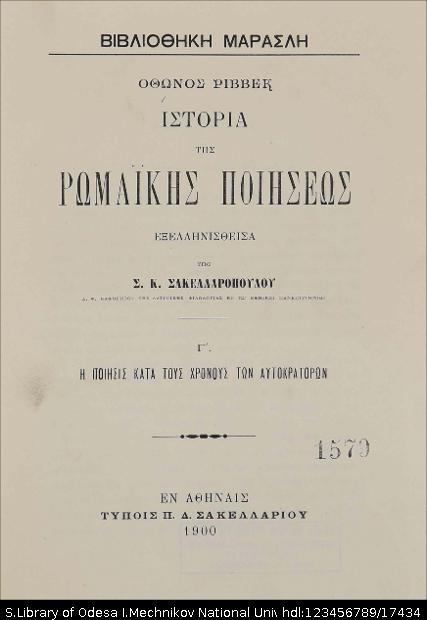 Citation: | Ριввеқ, Οθωνοσ (Ribbeck, Otto; 1827-1898). Ιστορια τησ ρωμαικησ ποιησεωσ : [σε 3 τ.] / εξελληνισθεισα υπο Σ. Κ. Σακελλαροπουλου … – Αφηναισ : Τυπ. Π. Δ. Σακελλαριου, 1897-1900. – (Βιβλιοθηκη Μαρασλη. Συλλογη εκκριτηων επιστημονικων χενων τε εν Ελληνικη, μεταφρασει και πρωτοτυπων συγγραμματων). Т. 3 : Η ποίησις κατά τους χρόνους των αυτοκρατόρων. – 1900. – 544, [2] σ. |