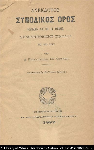 Citation: | Παπαδόπουλος-Κεραμεύς, Αθανάσιος (1856-1912). Ανέκδοτος Συνοδικός ὄρος : θεσπισθείς υπό της εν Νυμφαίω Συγκροτηθεισης Συνοδου το 1233 ετει / υπο Α. Παπαδοπουλου του Κεραμεως. – Κωνσταντινουπολη [İstanbul] : Πατριαρχικό τυπ., 1882. – 20 σ. |