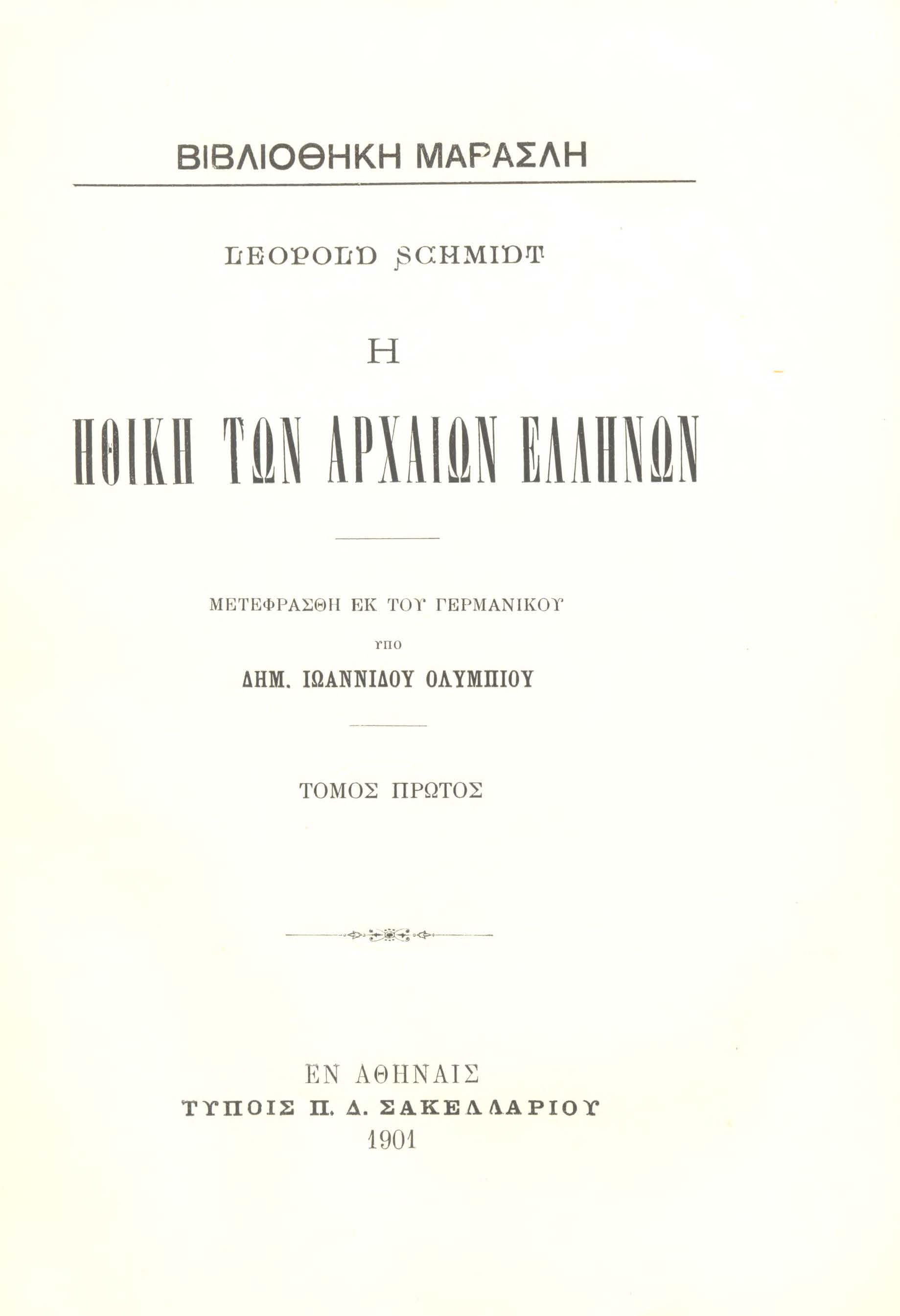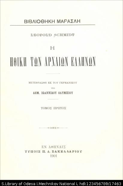 | Бібліографічний опис: | Schmidt, Leopold (Σμιτ, Λεοπολδος ; 1824-1892). Η ηθικη των Αρχαιων Ελληνων : [σε 2 τ.] / μετεφρασθη εκ του γερμανικου υπο Δημ. Ιωαννιδου Ολυμπιου. – Αθηνα : Τυπ. Π. Δ. Σακελλαριου, 1901. – (Βιβλιοθηκη Μαρασλη. Συλλογη εκκριτηων επιστημονικων χενων τε εν Ελληνικη, μεταφρασει και πρωτοτυπων συγγραμματων). Т. 1. – 1901. – 491, [1] σ. |