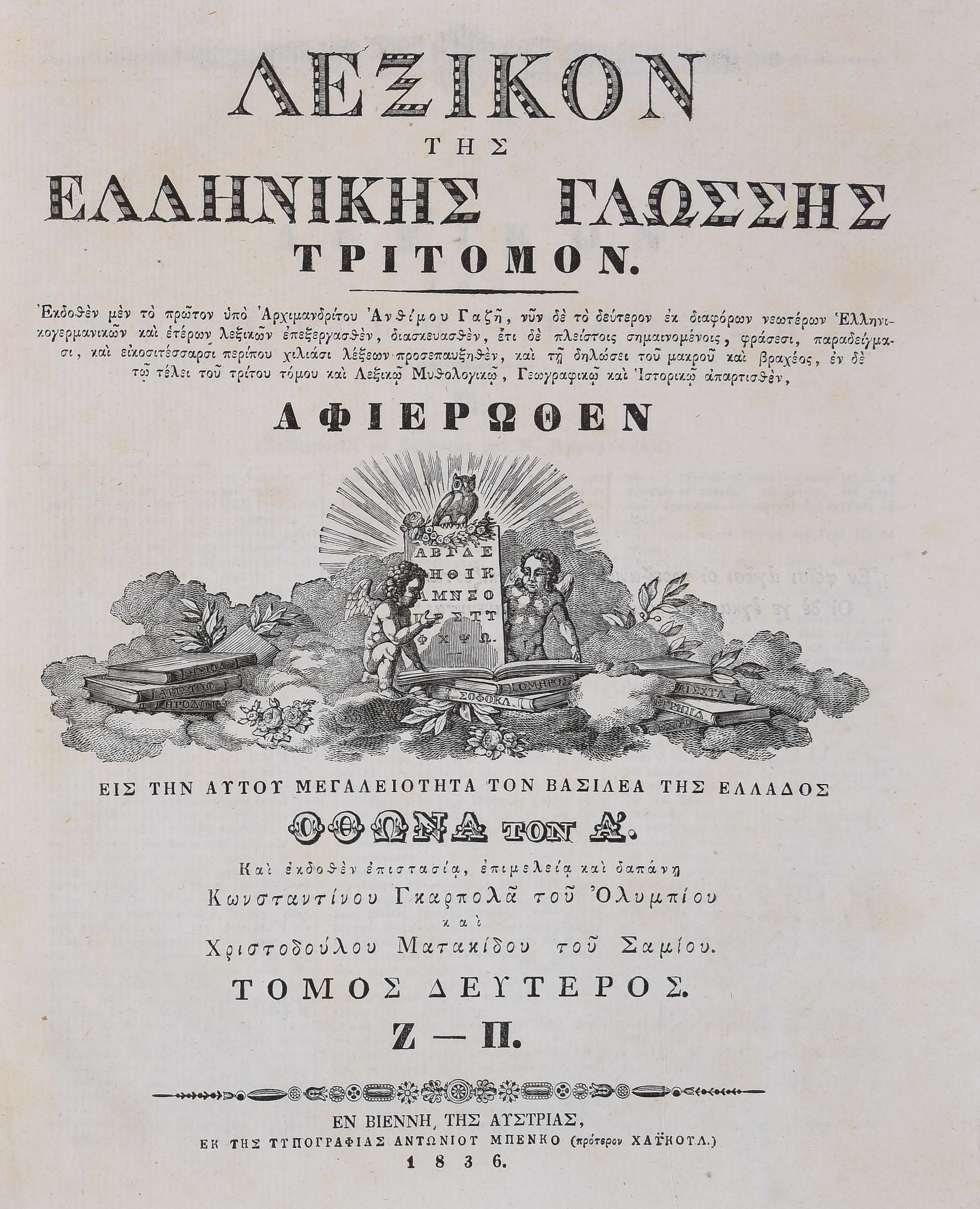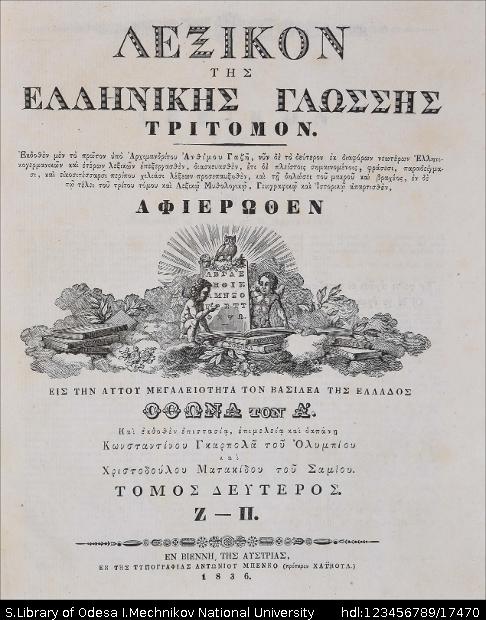 Бібліографічний опис: Λεξικόν της Ελληνικής Γλώσσης : σε 3 τ. / εκδοθέν μεν πρώτον υπό αρχιμανδρίτου Ανθίμου Γαζή, νυν δε το δεύτερον εκ διαφόρων νεωτέρων Ελληνικογερμανικών και ετέρων λεξικών επεξεργασθέν, διασκευασθέν, έτι δε πλείστοις σημαινομένοις, φράσεσι, παραδείγμασι, και εικοσιτέσσαρσι περίπου χιλιάσι λέξεων προσεπαυξηθέν, και τη δηλώσει του μακρού και βραχέος, εν δε τω τέλει του τρίτου τόμου και Λεξικώ Μυθολογικώ, Γεωγραφικώ και Ιστορικώ απαρτισθέν … ; και εκδοθέν επιστασία, επιμελεία και δαπάνη Κωνσταντίνου Γκαρπολά του Ολυμπίου και Χριστοδούλου Ματακίδου του Σαμίου. - Βιέννη [Wien], Αυστρία [Österreich] : Εκ της Τυπογραφίας Αντωνίου Χάυκουλ, 1835-1837. Т. 2 : Ζ–Π. – 1836. – [4], 931, [1] σ.