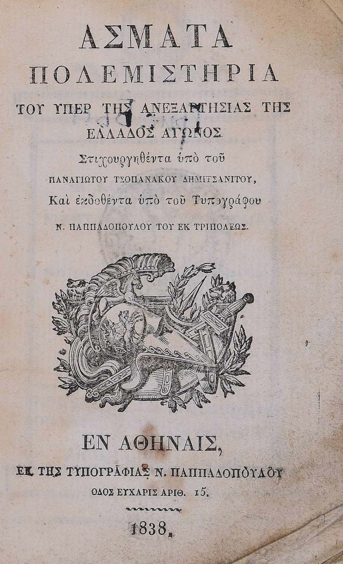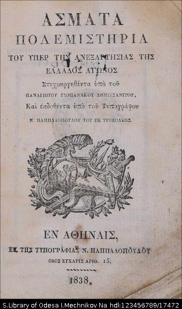 | Назва: | Άσματα Πολεμιστήρια του υπέρ της Ανεξαρτησίας της Ελλάδος αγώνος |