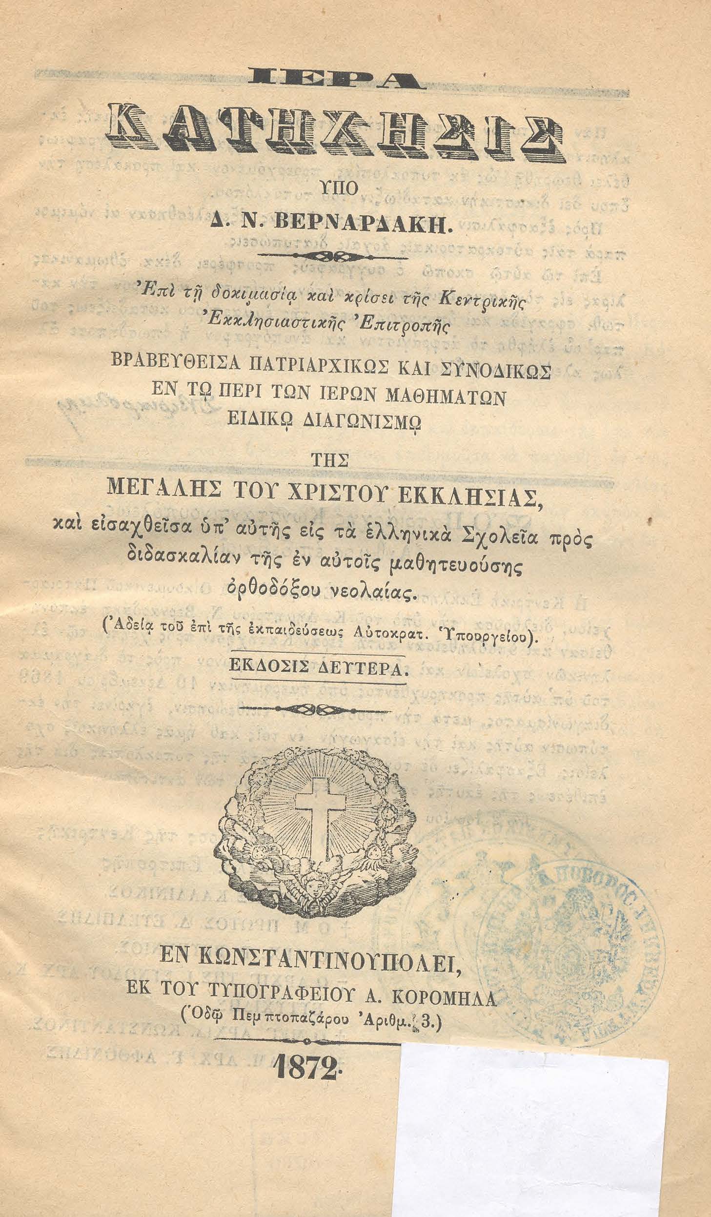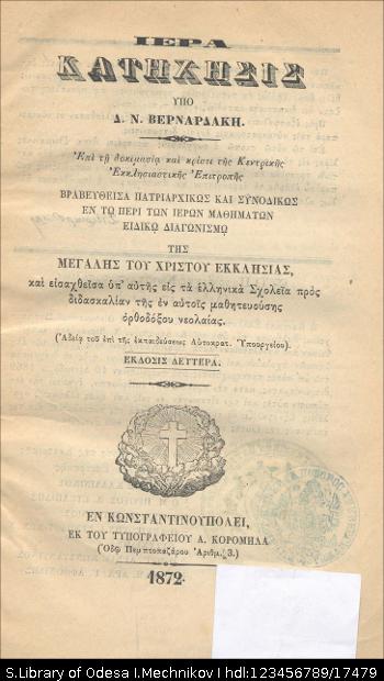 | Бібліографічний опис: | Βερναρδάκης, Δημήτριος Ν. (1833-1907). Ιερα Κατηχησισ / υπο Δ. Ν. Βερναρδάκης ; επί τη δοκιμασία και κρίσει της Κεντρικής Εκκλησιαστικής Επιτροπής βραβευθείσα πατριαρχικώς και συνοδικώς εν τω περί των Ιερών Μαθημάτων ειδικώ διαγωνισμώ της Μεγάλης του Χριστού Εκκλησίας, και εισαχθείσα υπ' αυτής εις τα ελληνικά Σχολεία προς διδασκαλίαν της εν αυτοίς μαθητευούσης ορθοδόξου νεολαίας ... – 2η εχδ. – Κωνσταντινουπολη [İstanbul] : Εκ της Τυπ. Α. Κορομηλα, 1872. – 256 σ. |