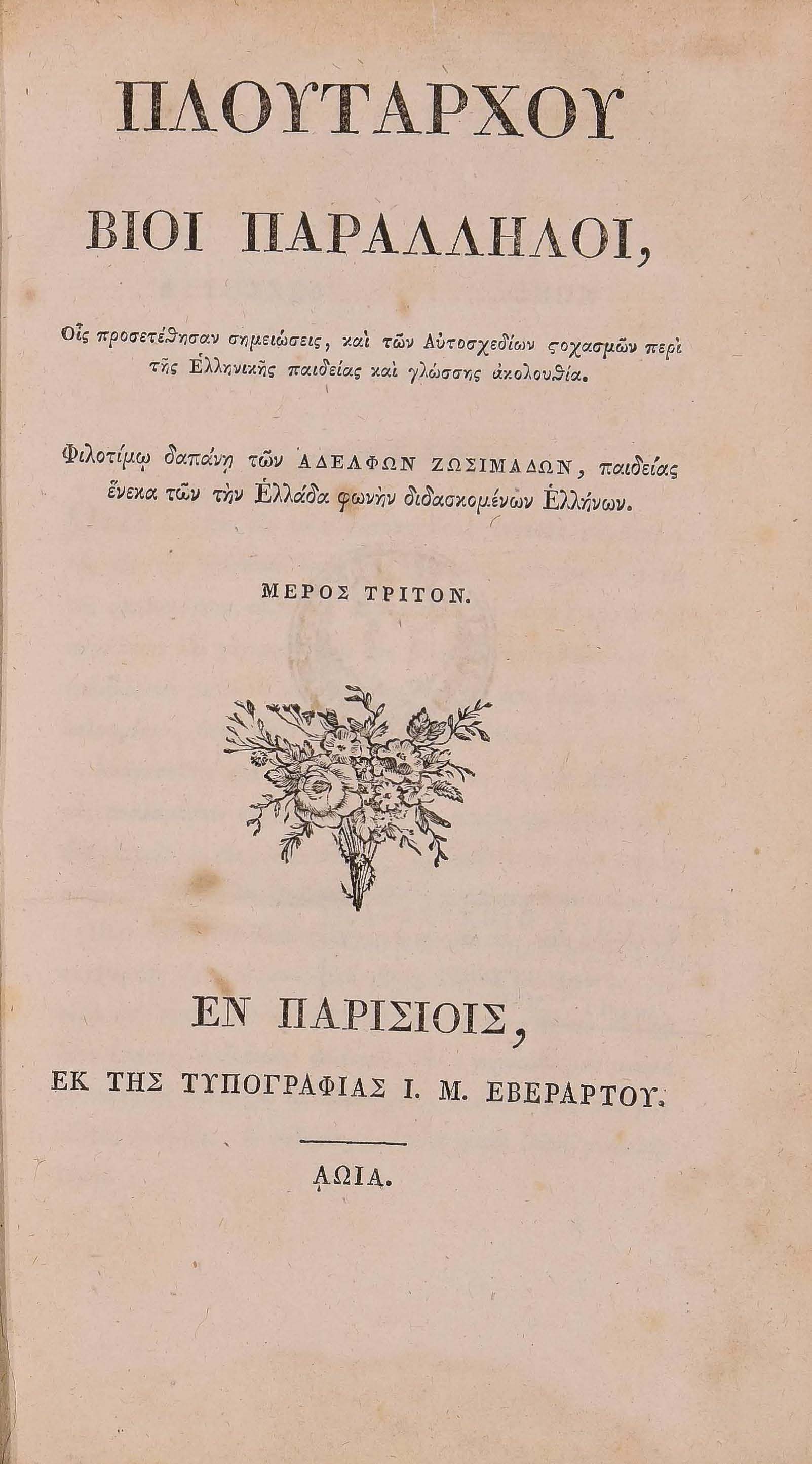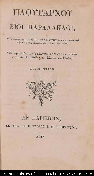 Бібліографічний опис: Πλούταρχος (Plutarchus ; περ. 45 – περ. 127). Πλουτάρχου Βίοι Παράλληλοι, Οις προσετέθησαν σημειώσεις, και των Αυτοσχεδίων στοχασμών περί της Ελληνικής παιδείας και γλώσσης ακολουθία : [σε 6 τ.]. – Εν Παρισίοις [Paris] : εκ της Τυπογραφίας Ι. Μ. Εβεράρτου, 1809-1814. – (Ελληνική Βιβλιοθήκη, τ. 40, 44, 53, 63). T. 3 (53). – 1811. – [92], 466, [2] σ.