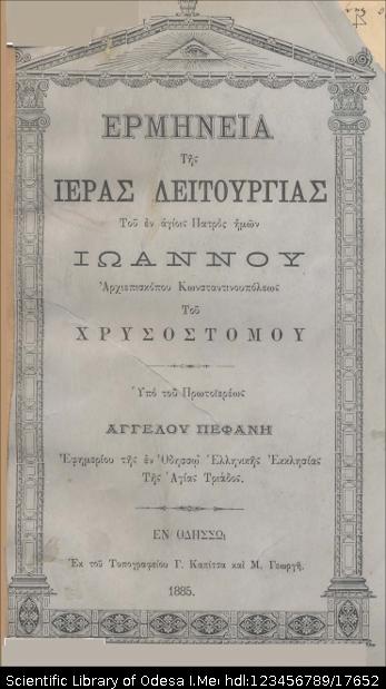 | Бібліографічний опис: | Ερμηνεία τῆς Ιερας λειτουργίας τοῦ έν άγίοις Πατρὸς ήμῶν Ιωαννογ Αρχιεπίσκοπου Κωνσταντινουπόλεως τοῦ Χρυσόστομου / υπο του πρωτοιερεως Αγγελου Πεφανη ... – Οδησσό [Одеса] : Τuπ. Γ. Καπίτσα καί Μ. Γεωργή, 1885. – 87, [3] σ. |