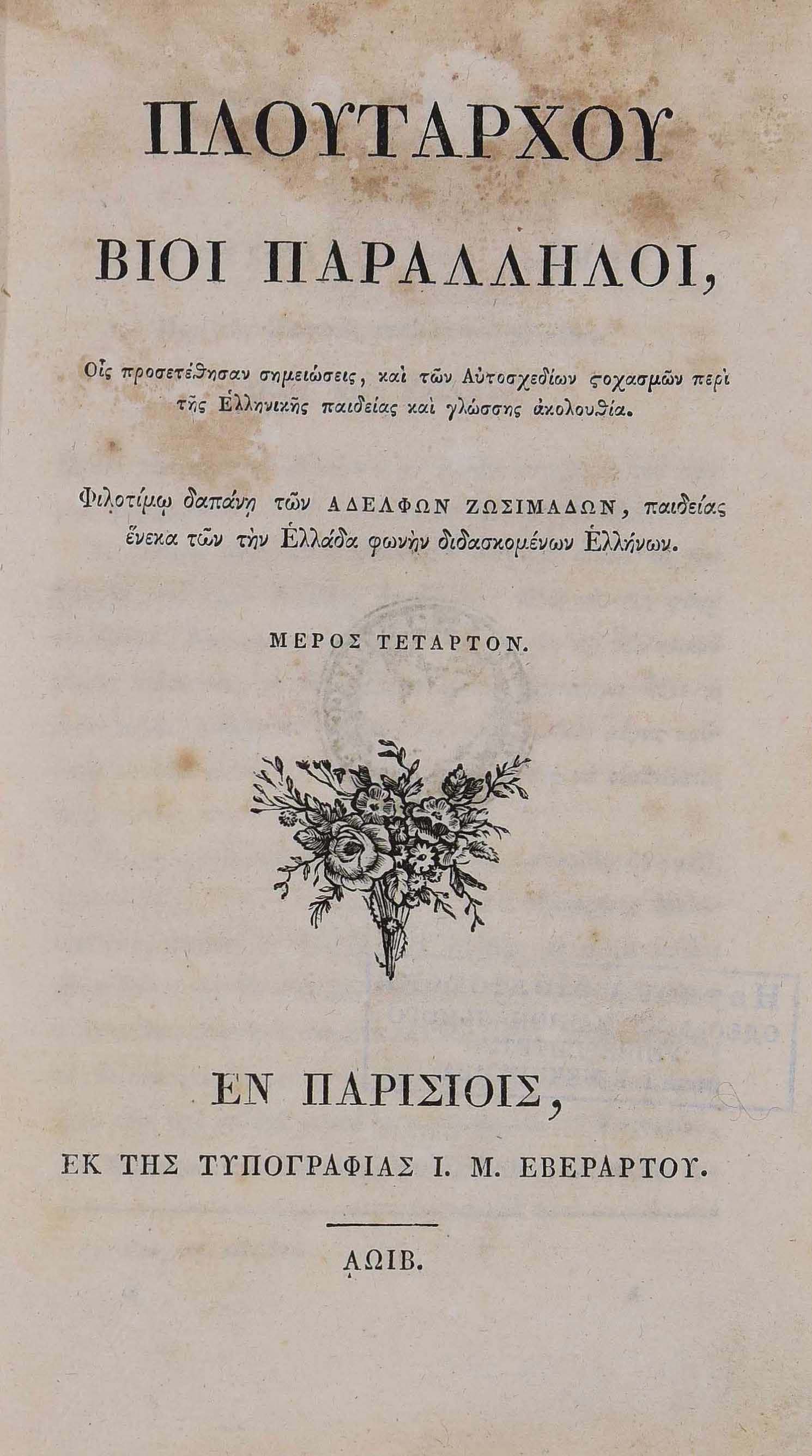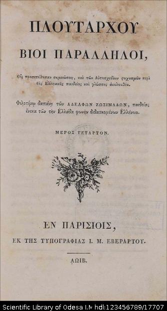 | Бібліографічний опис: | Πλούταρχος (Plutarchus ; περ. 45 – περ. 127). Πλουτάρχου Βίοι Παράλληλοι, Οις προσετέθησαν σημειώσεις, και των Αυτοσχεδίων στοχασμών περί της Ελληνικής παιδείας και γλώσσης ακολουθία : [σε 6 τ.]. – Εν Παρισίοις [Paris] : εκ της Τυπογραφίας Ι. Μ. Εβεράρτου, 1809-1814. – (Ελληνική Βιβλιοθήκη, τ. 40, 44, 53, 63). T. 4 (63). – 1812. – [52], 526 σ. |
