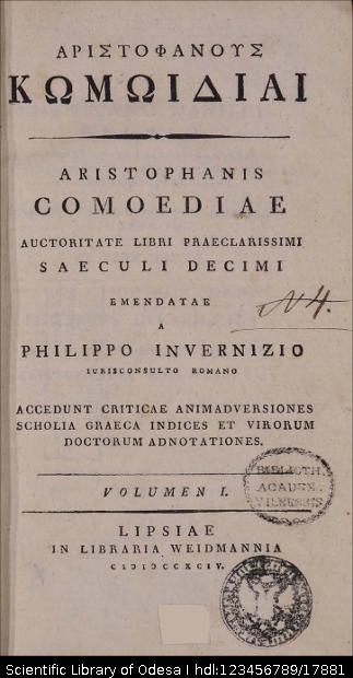 | Бібліографічний опис: | Αριστοφάνησ (Aristophanes ; 445 π. Χ. – 386 π. Χ.). Αριστοφανουσ κωμωιδιαι = Aristophanis comoediae : auctoritate libri praeclarissimi saeculi decimi : [in 2 vol.] / emendatae a Philippo Invernizio ... ; accedunt criticae animadversiones, scholia graeca et virorum doctorum adnotationes. – Lipsiae [Leipzig] : іn libraria Weidmannia, 1794. Vol. 1. – 1794. – XXXVI, 603, [1] p., 1 f. tabl. ; 8⁰ (20,5x12x3,5 cm). |