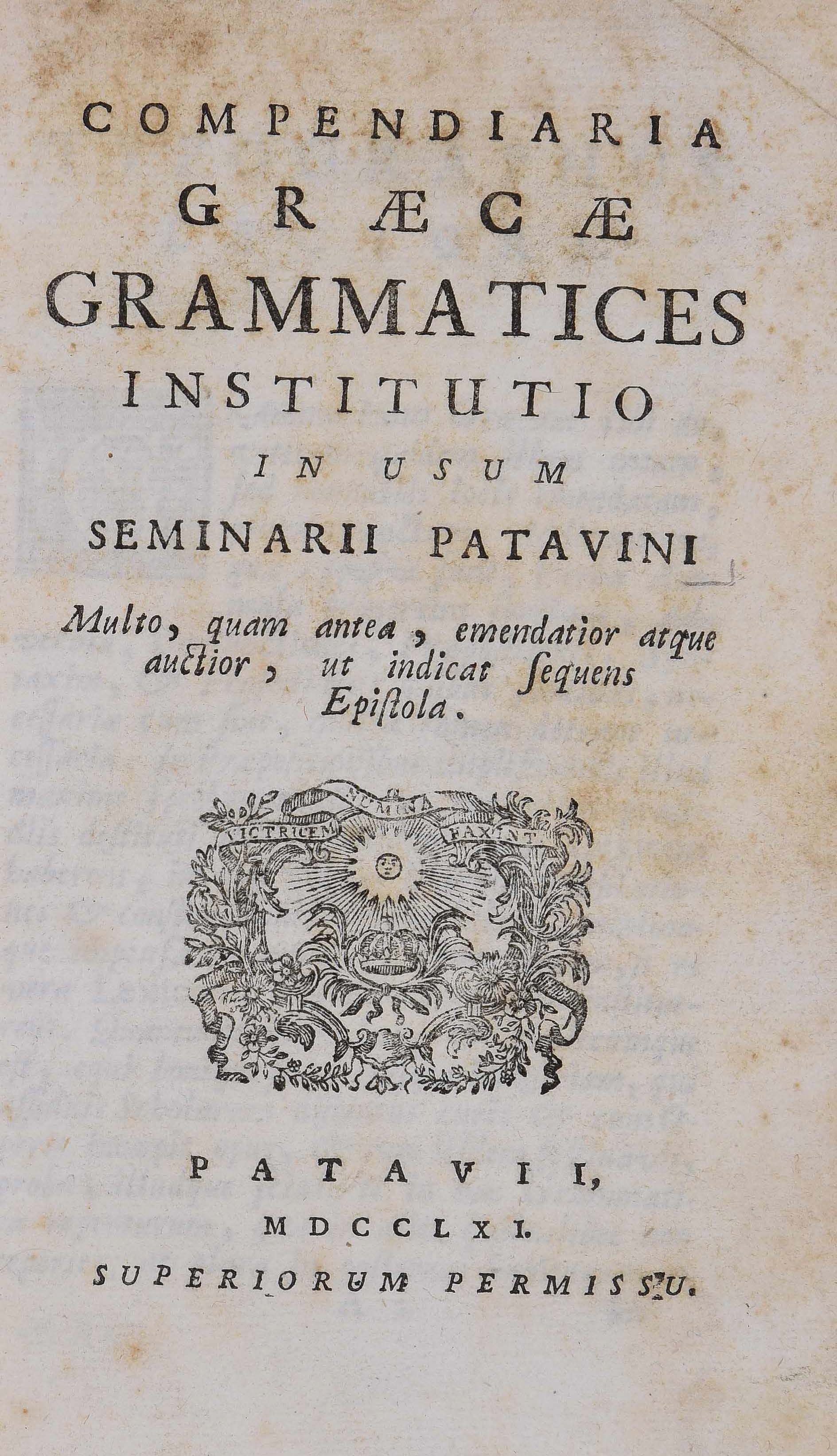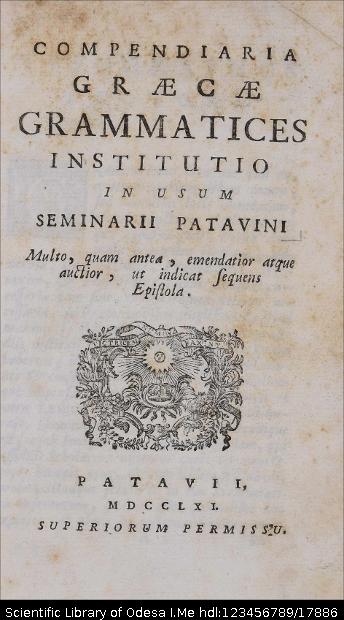 | Бібліографічний опис: | Compendiaria Graecae grammatices institutio : in usum Seminarii Patavini : multo quam antea emendatior atque auctior ut indicat sequens epistola / [compil. Jacopo Facciolati]. – Patavii [Padova] : [Stamperia del Seminario], 1761. – 228 p. ; 8⁰ (18,6x11,5x1,4 cm). |