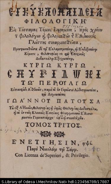 Бібліографічний опис: Εγκυκλοπαιδεία Φιλολογική : εις 4 τ. διηρημένη, / προς χρήσιν των φιλολόγων και φιλομαθών της Ελληνικής Γλώττης συναρμοσθείσα, Προσφωνηθείσα δε τω εκλαμπροτάτω ... κυρίω Σπυρίδωνι τω Περουλίω ... παρά του ... Ιωάννου Πατούσα ... – Ενετίησιν [Venezia] : παρά Νικολάω τω Σάρω, 1710. Т. 3. – 1710. – [8], 416 σ. ; 8° (19 εκ.).