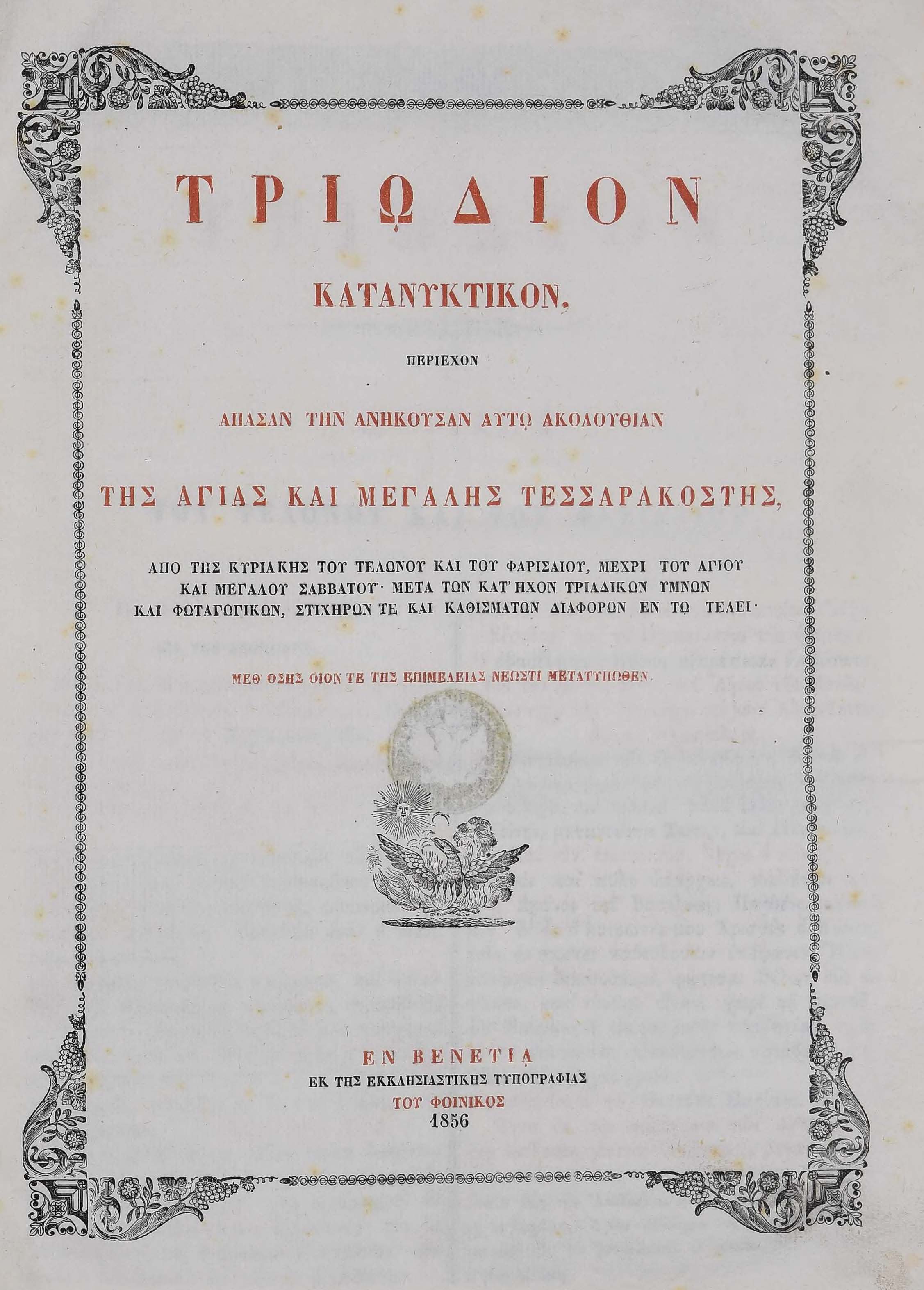 Бібліографічний опис: Τριώδιον Κατανυκτικόν : περιέχον άπασαν την ανήκουσαν αυτώ Ακολουθίαν της Αγίας και Μεγάλης Τεσσαρακοστής από της Κυριακής του Τελώνου και του Φαρισαίου μέχρι του Αγίου και Μεγάλου Σαββάτου μετά των κατ'ήχον τριαδικών ύμνων και φωταγωγικών στιχηρών τε και καθισμάτων διαφόρων, εν τω τέλει … –Βενετια [Venezia] : Εκ της εκκαησιαστικης τυπ. του Φοινικος, 1856. – [4], 455, [1] σ.