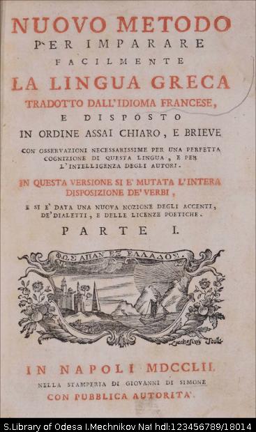| Бібліографічний опис: | Lancelot, Claude (1615–1695), Arnauld, Antoine (1612–1694). Nuovo metodo per imparare facilmente la lingua greca : tradotto dall'idioma francese, disposto in ordine assai chiaro, e brieve ... ; in questa versione si e mutata l'intera disposizione de' verbi, e si e data una nuova nozione degli accenti, de' dialetti, e delle licenze poetiche : in 2 p. / C. Lancelot; A. Arnauld. – Napoli : nella stamperia di Giovanni di Simone, 1752. P. 1. – 1752. – XXXII, 1-328, [2] p. ; 8⁰ (17x11,3x1,8 cm). |