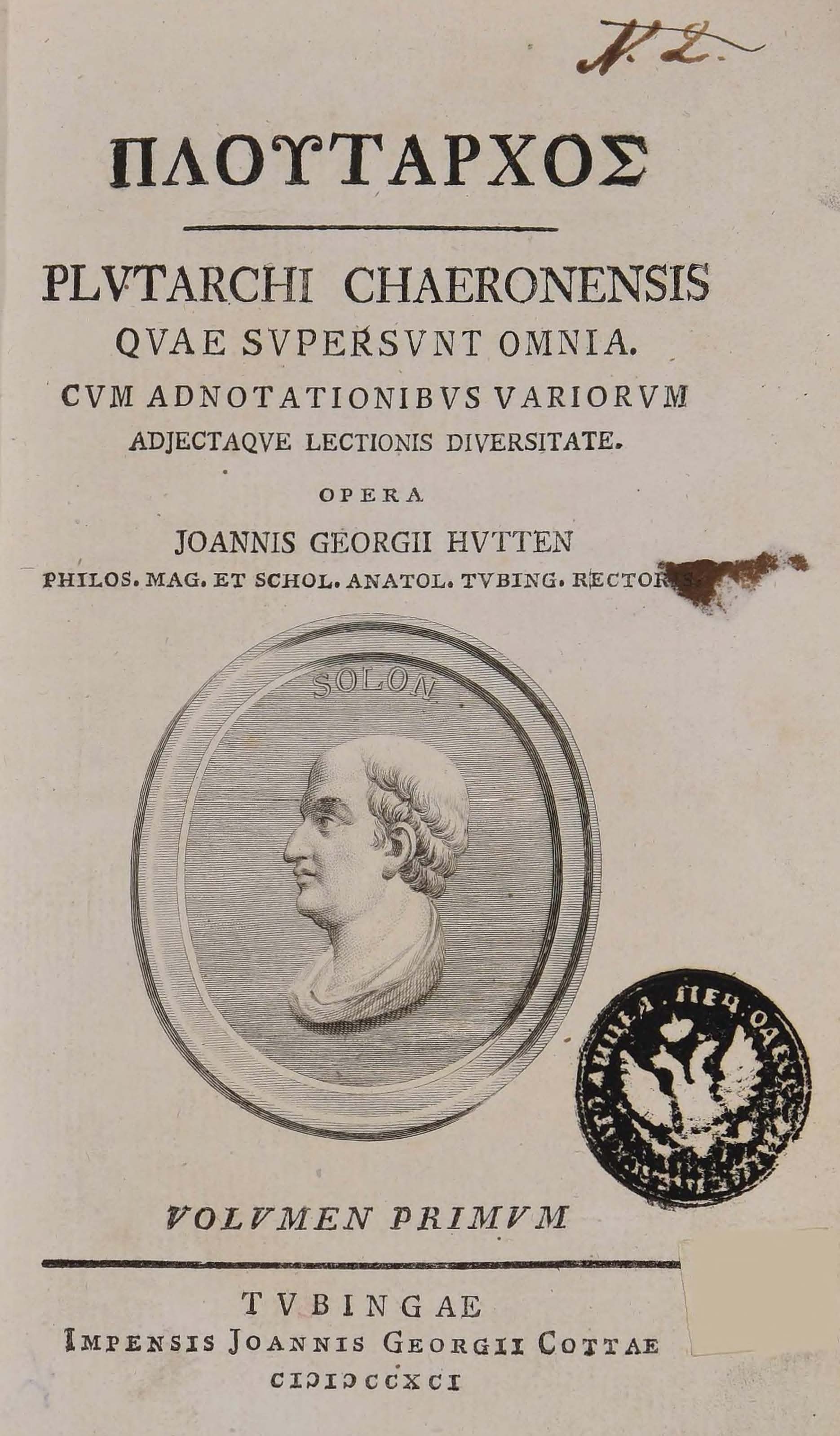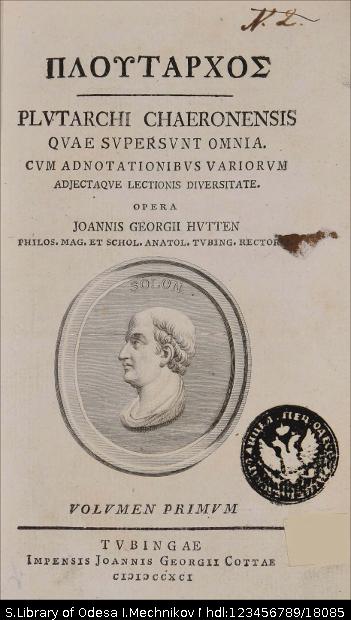 | Бібліографічний опис: | Πλουταρχος (Plutarchus ; περ. 46 – 120 μ. Χ.). Plutarchi Chaeronensis quae supersunt omnia : cum adnotationibus variorum adjectaque lectionis diversitate : [in 14 vol.] / opera Johannis Georgii Hutten ... – Tubingae [Tübingen] : imprensis Joannis Georgii Cottae, 1791–1804. Vol. 1. – 1791. – [2], XI, [3], 498 p. ; 8⁰ (20,5x11,5x2 cm). |