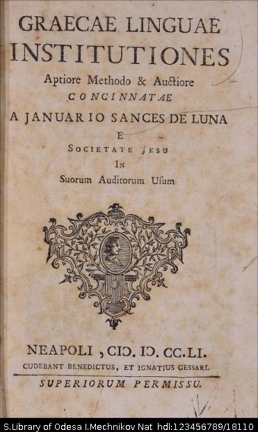 | Бібліографічний опис: | Sances de Luna, Januario (Sanchez de Luna, Gennaro). Graecae linguae institutiones / aptiore methodo et auctiore concinnatae a Januario Sances de Luna … in suorum auditorum usum. – Neapoli [Napoli] : Cudebant Benedictus, et Ignatius Gessari, 1751. – [16], 351, [1] p. ; 8° (16,5x11x1,8 cm). |