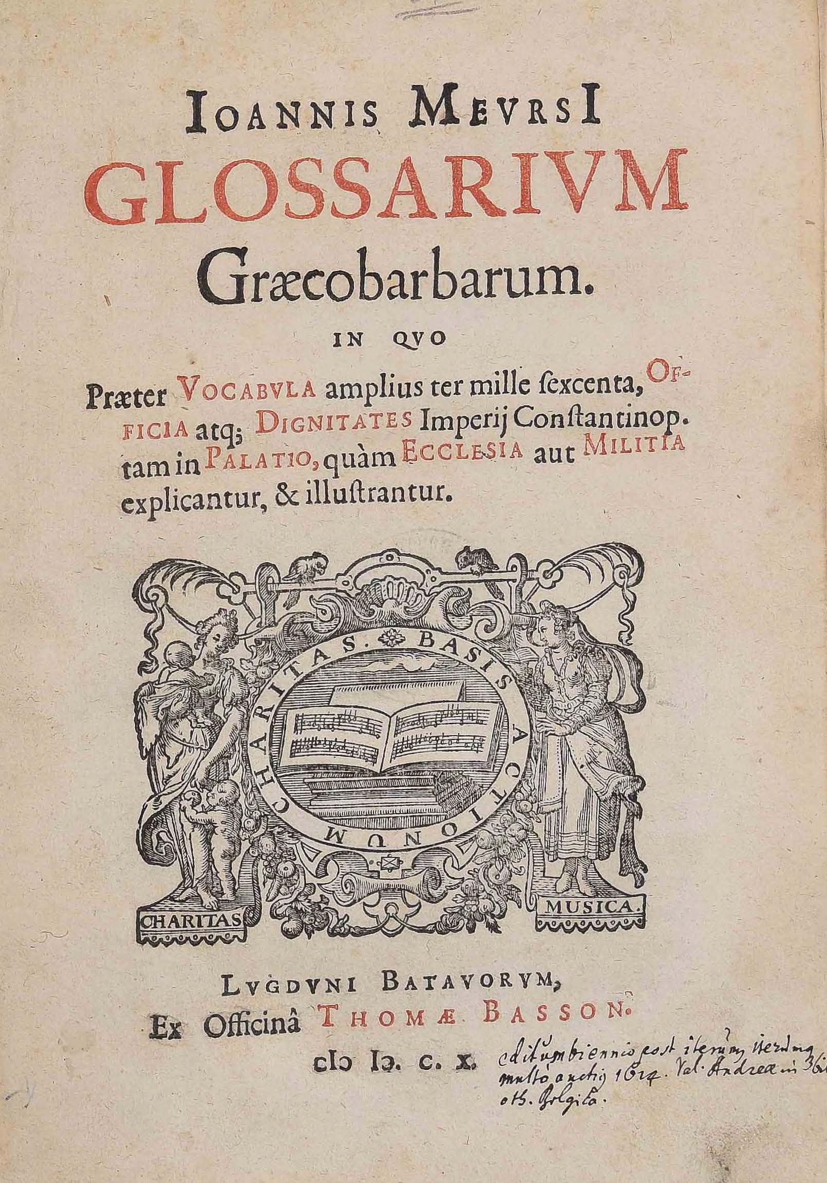 | Бібліографічний опис: | Meursius, Ioannes (1579-1639). Ioannis Meursi Glossarium Graecobarbarum : in quo praeter vocabula amplius ter mille sexcenta, officia atq[ue] dignitates Imperij Constantinop. tam in palatio, quàm ecclesia aut militia explicantur, et illustrantur. – Lugduni Batavorum [Leiden] : ex officinâ Thomae Basson, 1610. – [16], 808 [i. e. 809], [29] p. ; 4⁰ (23x17x4 cm). |