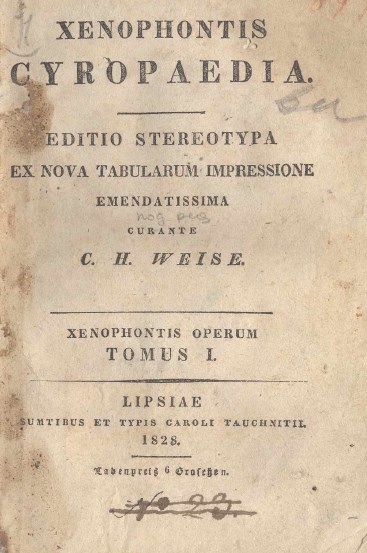 Бібліографічний опис: Xenophon (Ξενοφῶν ; περ. 430 - περ. 356 π. Χ.). Xenophontis Operum : [in 6 t.]. – Ed. ster. ex nova tabularum impressione emendatissima curante C. H. Weise. – Lipsiae [Leipzig] : sumtibus et typis C. Tauchnitii, 1828-1829. Τ. 1 : Xenophontis Cyropaedia. – 1828. – [2], 382 p.