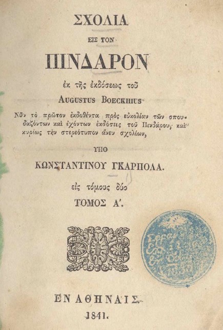 | Бібліографічний опис: | Böckh, Philipp August (1785-1867). Σχολια εις τον Πινδαρον : σε 2 τ. / εκ της εκδόσεως του Augustus Boeckhius ; νυν το πρώτον εκδοθέντα προς ευκολίαν των σπουδαζόντων και εχόντων εκδόσεις του Πινδάρου, και κυρίως την στερεότυπον άνευ σχολίων, υπο Κοωσταντινου Γκαρπολα. – Αθηνα : Τυπ. Κ. Γκαρπολά, 1841. T. 1. – 1841. – [4], 348, [4] σ. |
