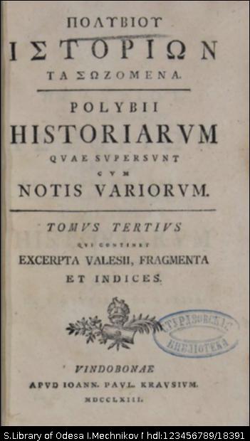 | dc.identifier.citation | Πολύβιος (Polybius; πιθ. 200 – πιθ. 120 π. Χ.). Πολυβου του Λυκορτα Ιστριων τα σωζομενα = Polybii Lycortae f. Historiarum : [in 3 t.] / quae supersunt interprete Isaaco Casaubono ex recensione Jacobi Gronovii cum notis Casaubonorum, Ursini, Valesii, Palmerii et Iacobi Gronovii ; accesit Aeneae Tactici com. de obsidione toleranda cum interpr. et notis Isaci Casauboni. Praefationem et glossarium Polybianum adiecit Io. Augustus Ernesti. – Lipsiae [Leipzig] : apud Io. Paul. Krausium, ..., 1763–1764. T. 3 : ... qui continent excerpta Valesii, fragmenta et indices. – Vindobonae [Wien] ; Lipsiae [Leipzig] : apud Ioann. Paul. Krausium ; ex officina Breitkopfiana, 1763. – [2], 704, [78], 138, [2] p. ; 8⁰ (20x12x4,5 cm). | uk_UA |