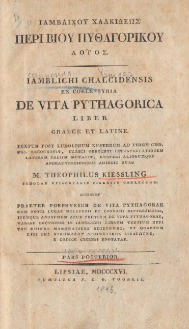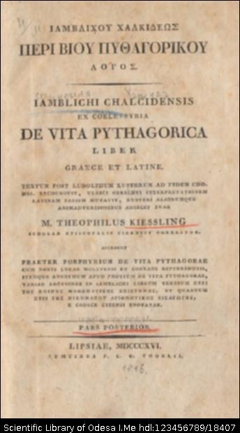 | Бібліографічний опис: | Ιάμβλιχος (Iamblichus Chalcidensis, 250-325). Ιαμβλιχου Χαλκιδεως Περι βιου Πυθαγορικου λογος = Iamblichi Chalcidensis ex Coele-Syria De vita Pythagoria : liber graece et latine : [in 2 t.] / textum post Ludolphum Kusterum ad fidem cdd. mss. recognovit, Ulrici Obrechti interpretationem Latinum passim mutavit, Kusteri aliorumque animadversionibus adiecit suas M. Theophilus Kiessling ... – Lipsiae [Leipzig] : sumtibus F. C. G. Vogelii, 1816. T. 2, p. 2. – 1816. – [2], 331, [3] p. |