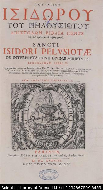 | Бібліографічний опис: | Ισίδωρος ο Πηλουσιώτης (άγιος ; Isidorus Pelusiota ; περ. 360/370 – περ. 440/450 μ. Χ.). Του Ισιδωρου του Πηλουσιωτου επιστολων βιβλια πεντε : εἰς τὴν ἑρμηνείαν τῆς Θείας Γραφῆς = Sancti Isidori Pelusiotae De interpretatione divinae scripturae Epistolarum libri 5. Quorum tres priores ex interpretatione Cl. V. Iac. Billij Prunaei, quartus autem a Cunrado Rittershusio IC. ... et quintus ab Andrea Schotto ... – Parisiis [Paris] : sumptibus Aegidii Morelli, 1638. – [52], 723, [120] p. ; 2° (39x24x5,5 cm). |
