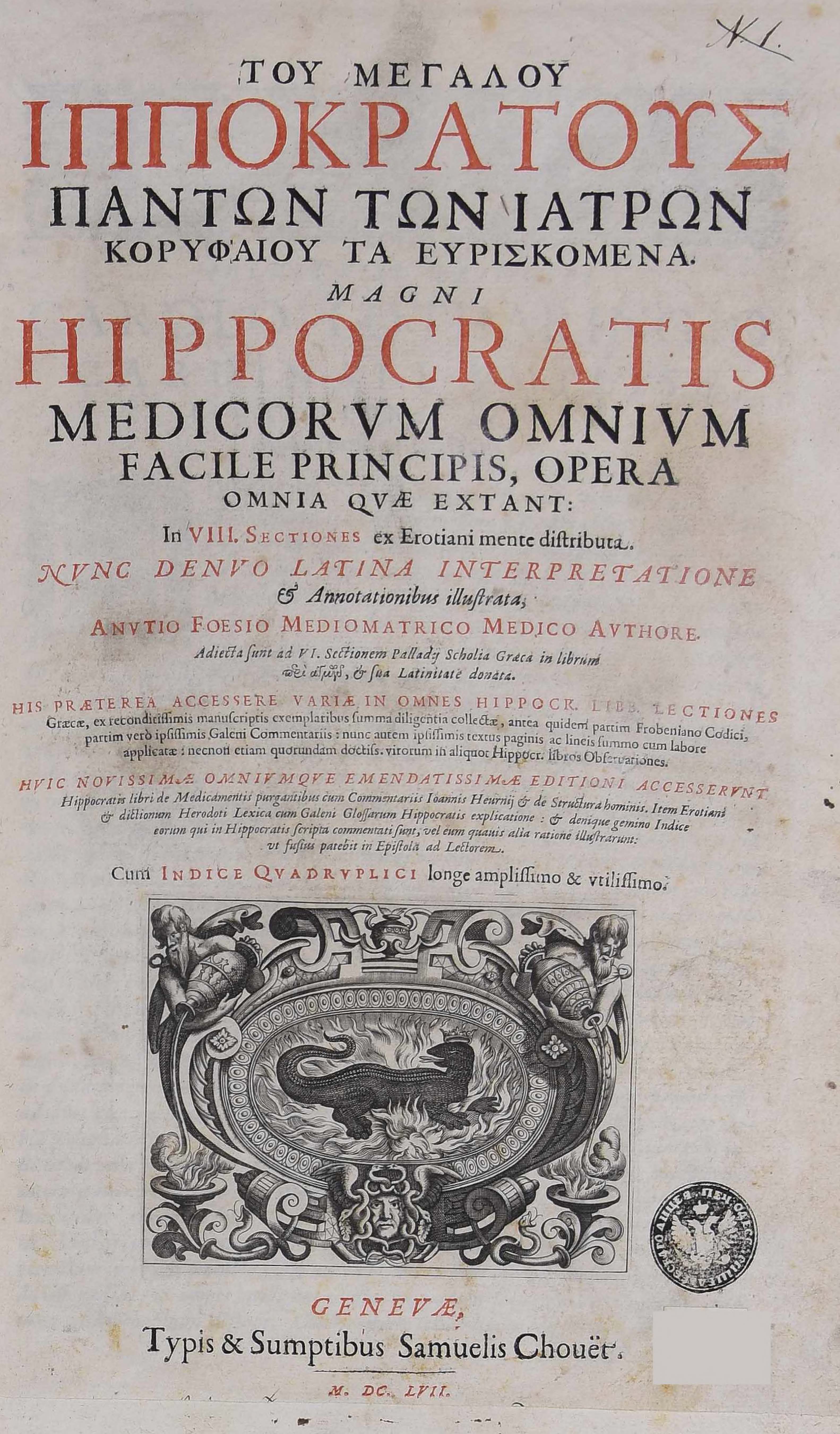 | Бібліографічний опис: | Ιπποκράτης (Hippocrates ; πιθ. 460 π. Χ. – πιθ. 370 π. Χ.). Του μεγάλου Ιπποκράτους πάντων των ιατρών κορυφαίου τα ευρισκόμενα = Magni Hippocratis medicorum omnium facile principis, Opera omnia quae extant : in VIII. sectiones ex Erotiani mente distributa / nunc denuo Latina interpretatione & annotationibus illustrata, Anutio Foesio … authore ; adiecta sunt ad VI. sectionem Palladij scholia Graeca in librum περί αγμών, et sua Latinitate donata ; his praeterea accessere variae in omnes Hippocr. libb. lectiones Graecae, ex reconditissimis manuscriptis exemplaribus summa diligentia collectae, antea quidem partim Frobeniano codici, partim vero ipsissimis Galeni commentariis: nunc autem impsissimis textus paginis ac lineis summo cum labore applicatae: necnon etiam quorundam doctiss. virorum in aliquot Hippocr. libros observationes ; huic nouissimae omniumque emendatissimae editioni accesserunt Hippocratis libri De medicamentis purgantibus cum commentariis Ioannis Heurnij et De structura hominis ; item Erotiani et dictionum Herodoti lexica cum Galeni glossarum Hippocratis explicatione: et denique gemino indice eorum qui in Hippocratis scripta commentati sunt, vel eum quauis alia ratione illustrarunt: ut Fusius patebit in epistola ad lectorem ; cum indice quadruplici longe amplissimo et vrilissimo. – Genevae [Genèva] : typis et simptibus Samuelis Chouët, 1657–1662. T. 1. – 1657. – [48], 933, [1] p. ; 2° (39x24,5x6 cm). |